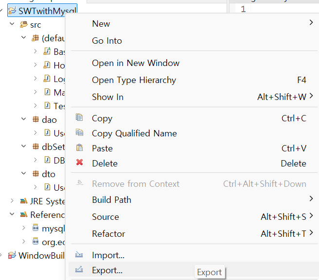 https://lamlic36.tistory.com/89 간단한 SWT 프로젝트https://lamlic36.tistory.com/87 이클립스 설치와 WindowBuilder 설정 방법이클립스 설치 및 WindowBuilder 설정 방법Java GUI 프로그래밍을 시작하려면, 이클립스(Eclipse) 설치와 함께 WindowBuilder 설정이 필요합니lamlic36.tistory.com앞선 프로젝트에서, 우리는 SWT와 Mysql을 이용해 실습 프로그램을 만들었습니다.위의 SWTwithMysql 프로젝트에서,window form 형태를 가진 프로그램이 생성된건데.이 친구를 eclipse 가 아닌 다른 곳에서 실행할 수는 없을까요?Jar 파일로 한번 만들어서 실행해 보겠습니다! 먼저 다음과 같이 프로젝..